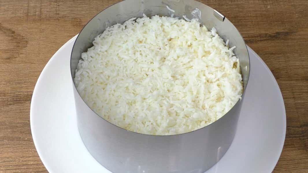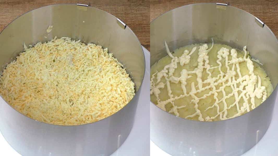 Я робитиму це за допомогою кільця. Першим шаром викладаємо картоплю. Розрівнюємо та злегка притискаємо, підсолюємо та змащуємо майонезом. Другим шаром кладемо тертий жовток. Розрівнюємо.