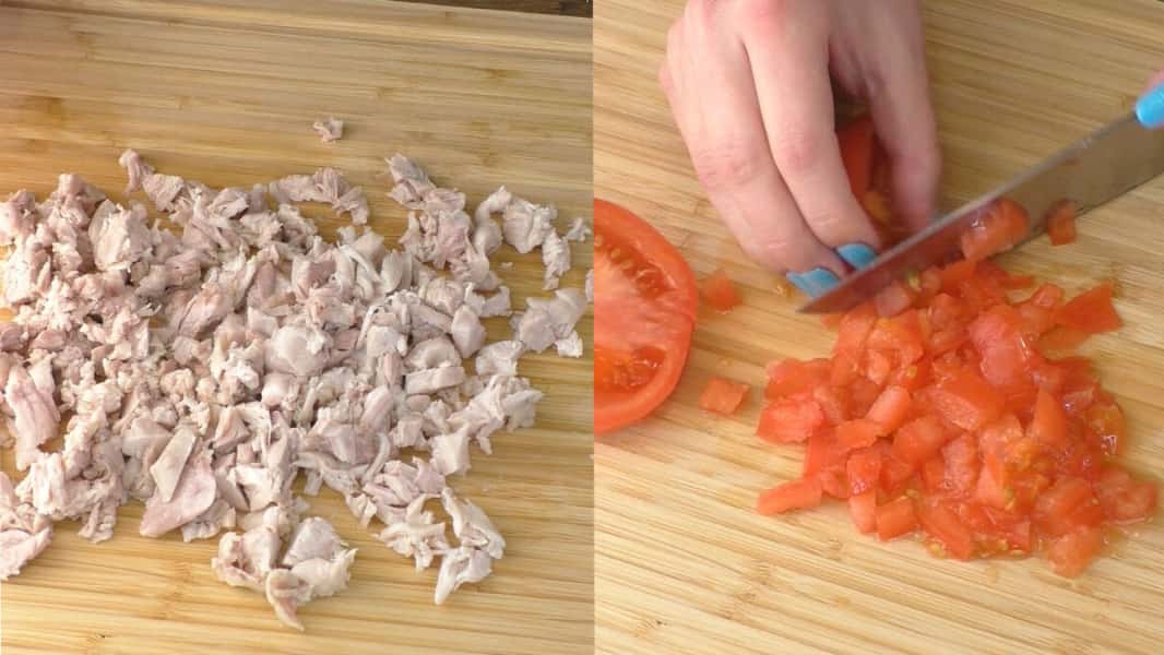 Свіжий помідор нарізаємо середнім кубиком, помідор бажано покласти в друшляк, щоб пішла зайва рідина. Відварену курячу грудку нарізаємо кубиком.