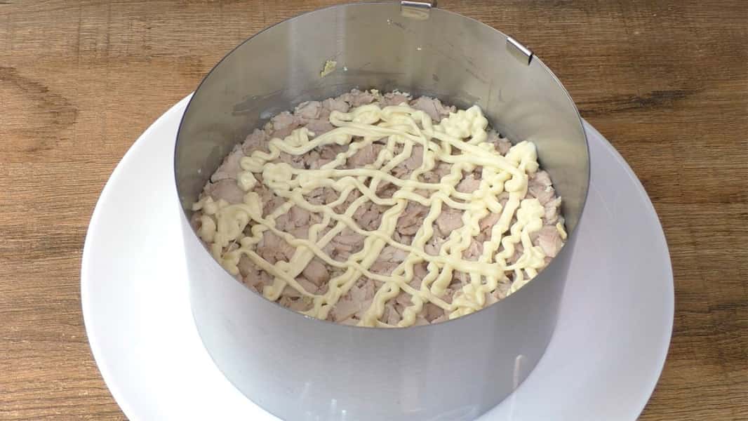 Третім шаром надсилаємо курку. Підсолюємо та змащуємо майонезом. Курку можна використовувати запечену або навіть копчену, вийде теж дуже смачно.