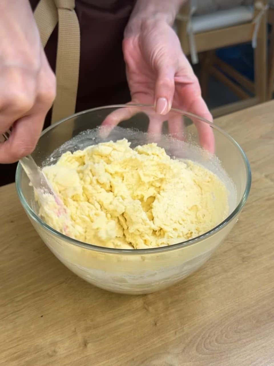 ▫️Додаємо борошно з розпушувачем, замішуємо тісто, густе, але липне до рук.