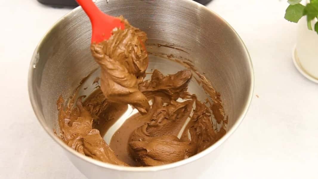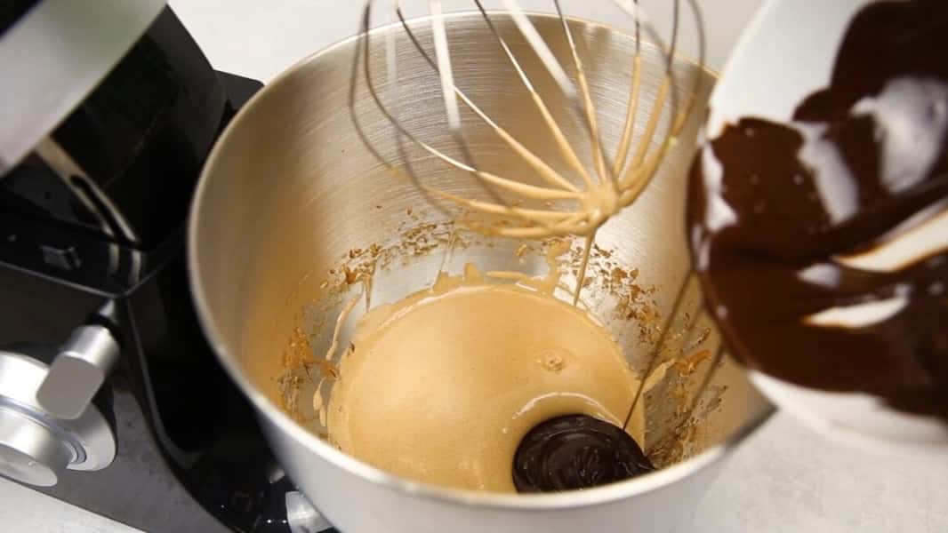 3. На водяній бані або в мікрохвильовій печі розтоплюємо шоколад і додаємо до маси з жовтків. Перемішуємо. Маса буде досить густою. Поступово вмішуємо до неї білки. Вручну, повільно, щоб білки не втратили своєї легкості. У результаті вийде рідке тісто.