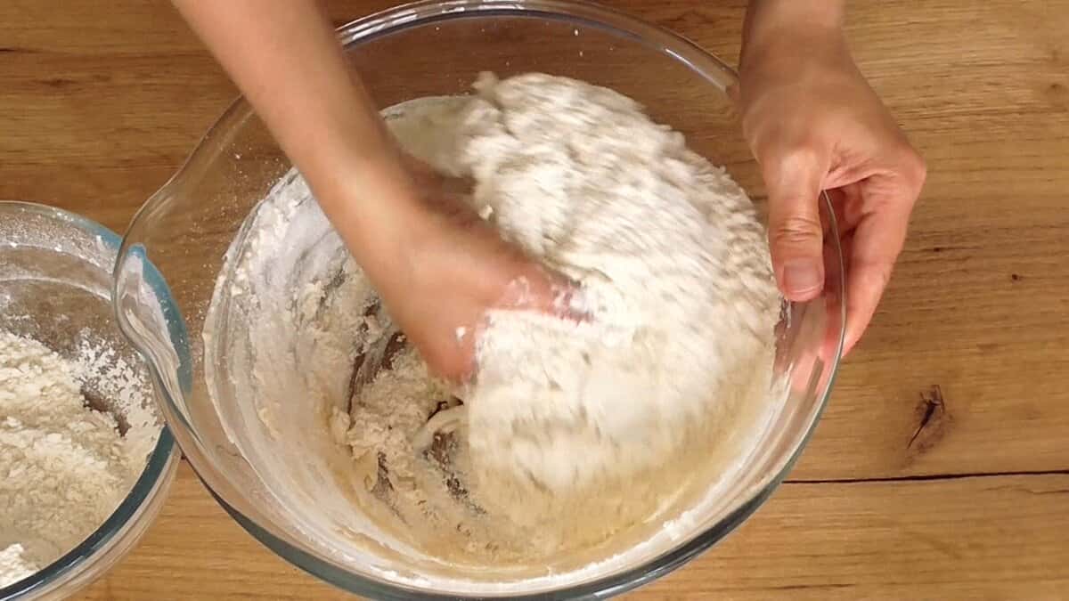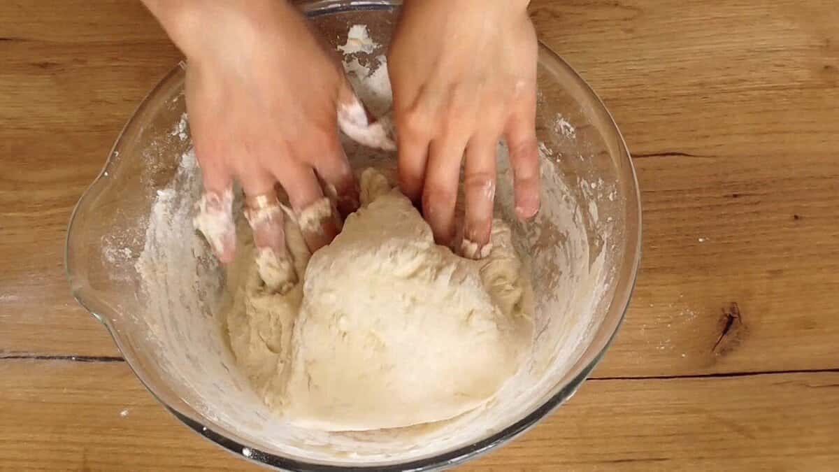 2. Поступово додаючи борошно замісити м’яке, живе тісто. Не забивайте занадто борошном, тому що буде розкатка і воно стане більш слухняним.