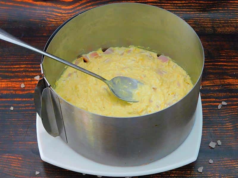 Зверху нанести намазку, що залишилася, і столову ложку майонезу. Прибрати у холодильник на 3-4 години. Зняти кільце, прикрасити за бажанням. Салат “Курочка ряба” готовий. Смачного!