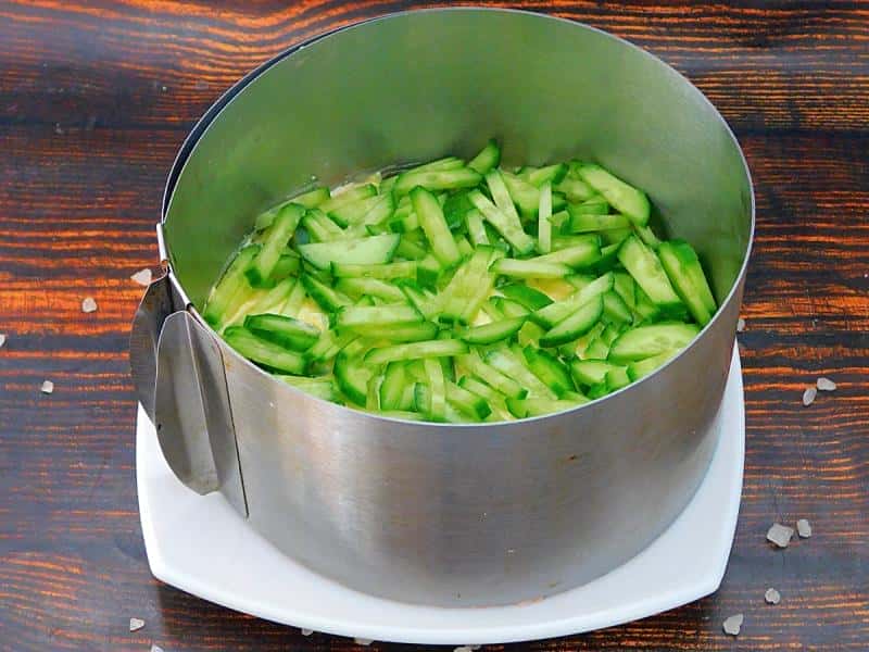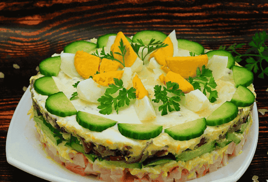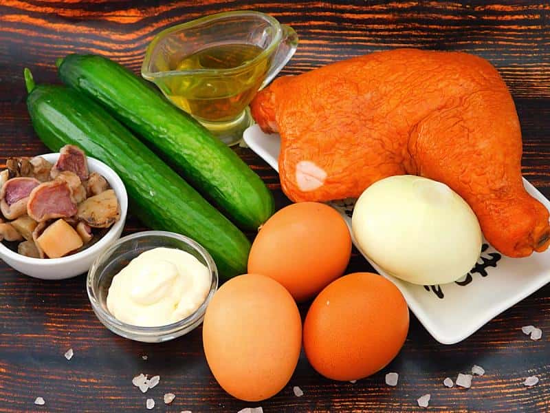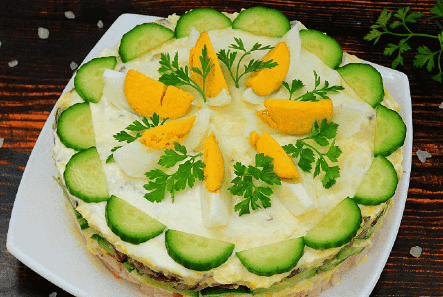 Приготуємо ситний, смачний та соковитий салат із копченою куркою, грибами та огірком. Це чудове рішення для свята, виглядає як торт, і дуже швидко “відлітає” зі столу.