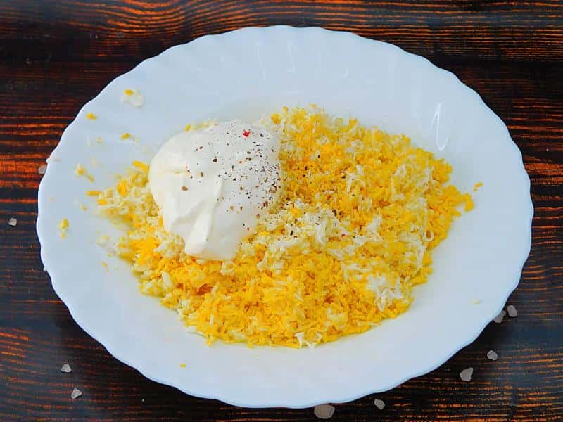 Варені яйця очистити та натерти на дрібній тертці. До них викласти майонез, посолити та поперчити. Змішати. Це буде соусом між шарами салату.