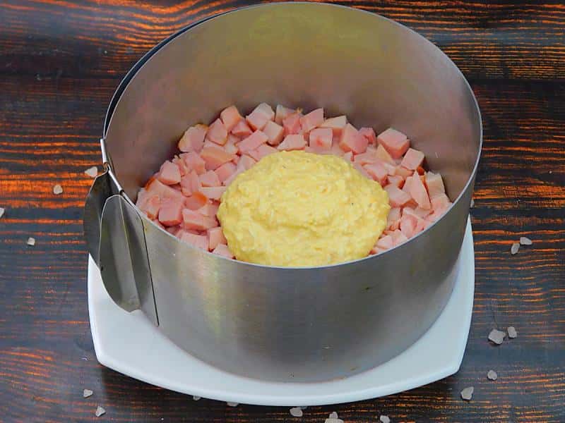 Страву зручно збирати у кулінарному кільці, тут діаметр 16 сантиметрів. Поставити його на плоску тарілку. Копчену курку нарізати кубиками і висипати в кільце. Зверху викласти третину яєчно-майонезної намазки.