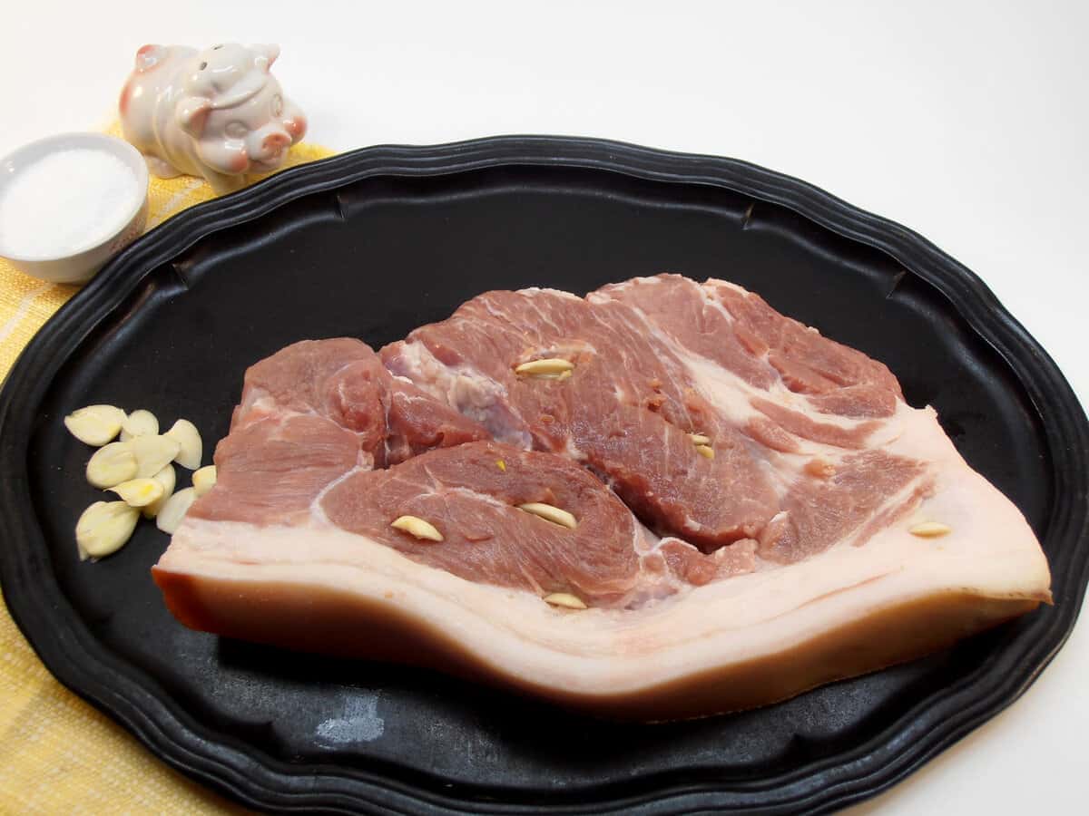 2. Часник попередньо почистити і нарізати на тонкі пластинки. За допомогою цього ж ножа проробляємо глибокі отвори. Робимо їх в декількох місцях по всій площі шматка і вставляємо туди пластинки часнику. Пластинки засовуємо якомога глибше.