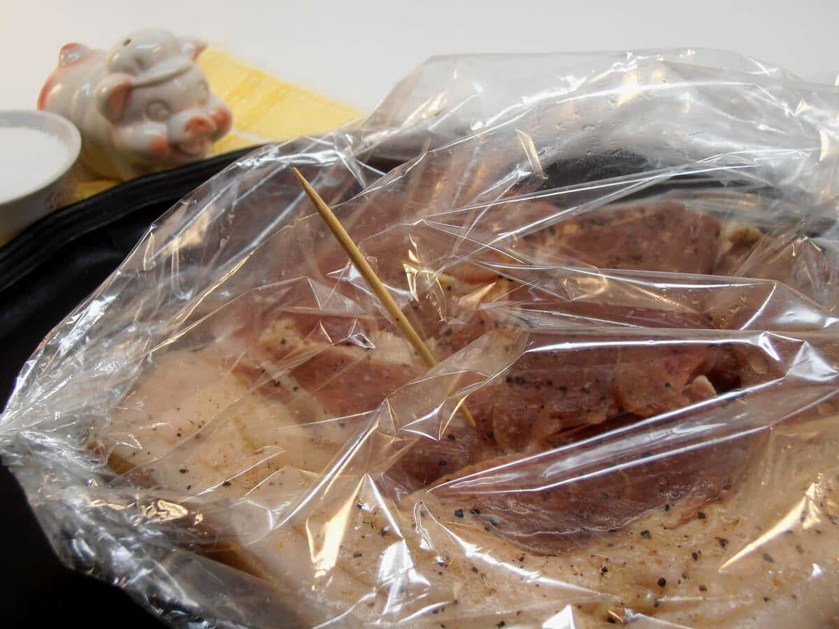 5. Відрізаємо рукав. За величиною він повинен бути трохи більше шматка. Зав’язуємо його з одного боку, кладемо м’ясо в рукав і зав’язуємо другий кінець. Зав’язувати можна на вузол, нитками. Щоб при нагріванні рукав не луснула, його слід проткнути в декількох місцях зубочисткою. Кладемо страву на деко і ставимо в духовку. Випікаємо 1 годину при температурі 180 градусів.