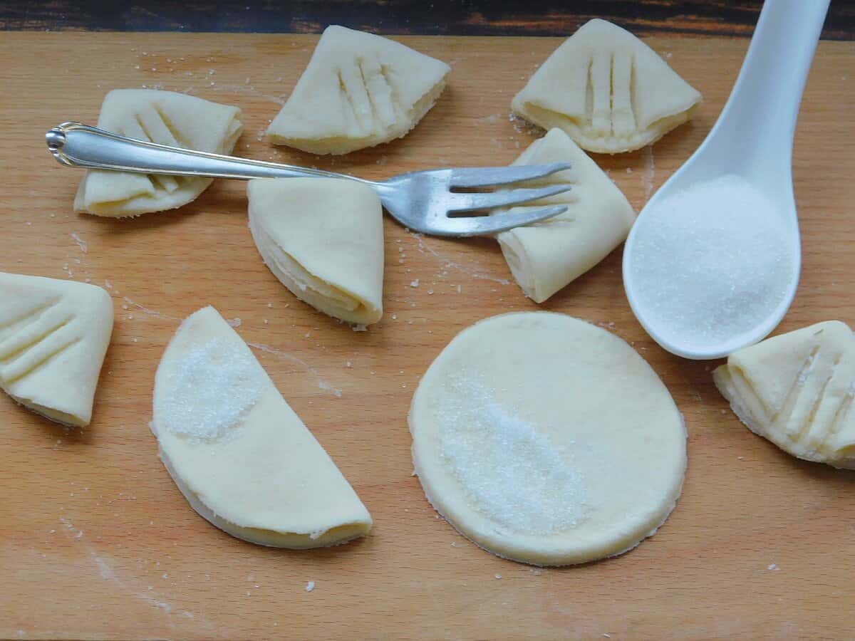 8. З одної половини кожної заготовки розподілити пів чайної ложки цукру. Скласти навпіл. Тепер помістити дрібку цукру на чверть отриманого півкола. Ще раз скласти. Зверху притиснути виделкою. Виходить, подібно гусячій лапці.