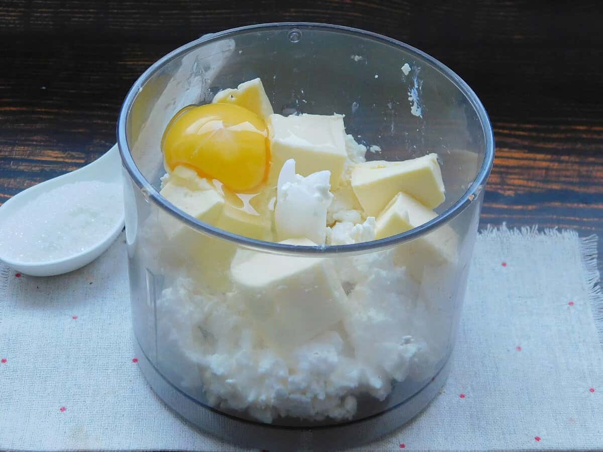 2. Тісто зручно робити в кухонному комбайні, але цілком можна і вручну ( в цьому випадку вершкове масло натерти на терці ). Отже, в чашу помістити сир, шматочки масла, одне яйце.