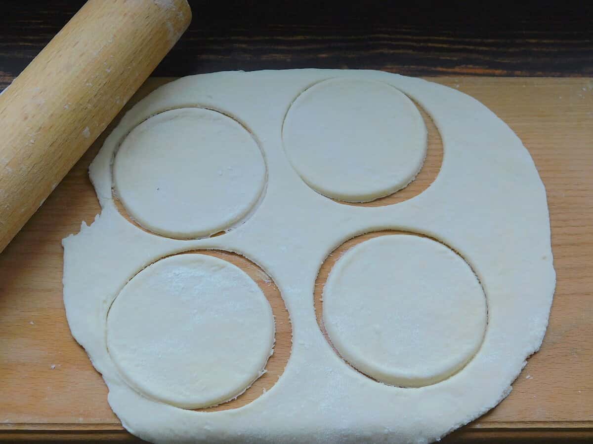 7. Розкачати в пласт товщиною пару міліметрів. Склянкою вирізати кружечки діаметром 8-9 сантиметрів.
