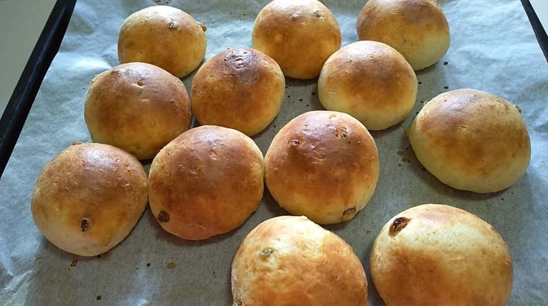 Ділимо тісто на 12 частин, формуємо булочки, укладаємо на лист застелений пекарським папером.