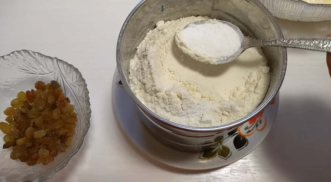 У чашу для просіювання борошна всипаємо 250 г борошна, 1 ч л розпушувача, розмішаємо і просіємо в сирну суміш, замішуємо тісто.