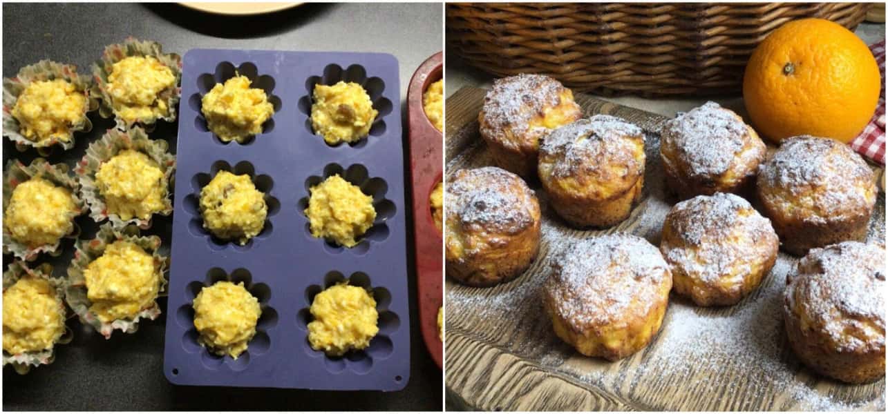 Ставимо заготівлю кексів в заздалегідь розігріту духовку до 200 градусів на 20 хвилин. Час випічки умовний, все залежить від обсягу формочки і плити. У мене випікалися кекси – 18 хвилин. Готові кекси дістаємо з духовки, остуджуємо і подаємо на стіл. Можна перед подачею на стіл, посипати кекси цукрової пудрою.
