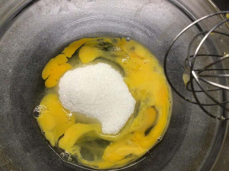 У миску треба розбити яйця і додати цукор. Вінчиком збиваємо до пишної піни.