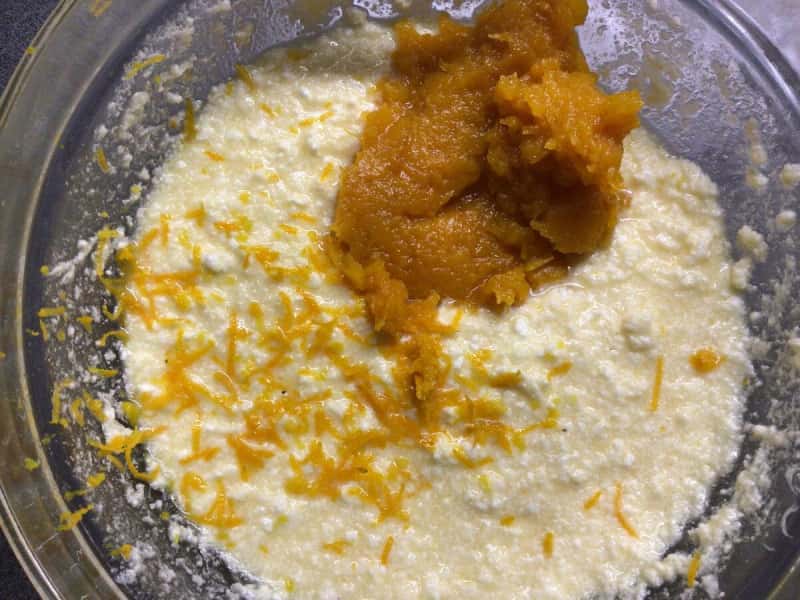 Додаємо гарбуз ( гарбуз я використовувала не сирий, а трішки пропарений), родзинки, цедру апельсина, лопаточкою все перемішуємо.