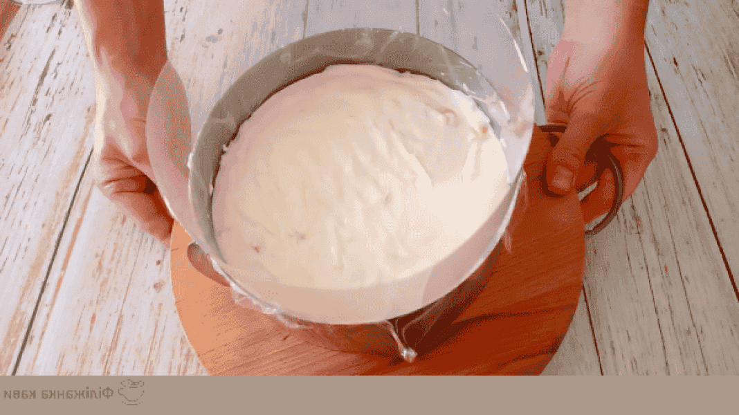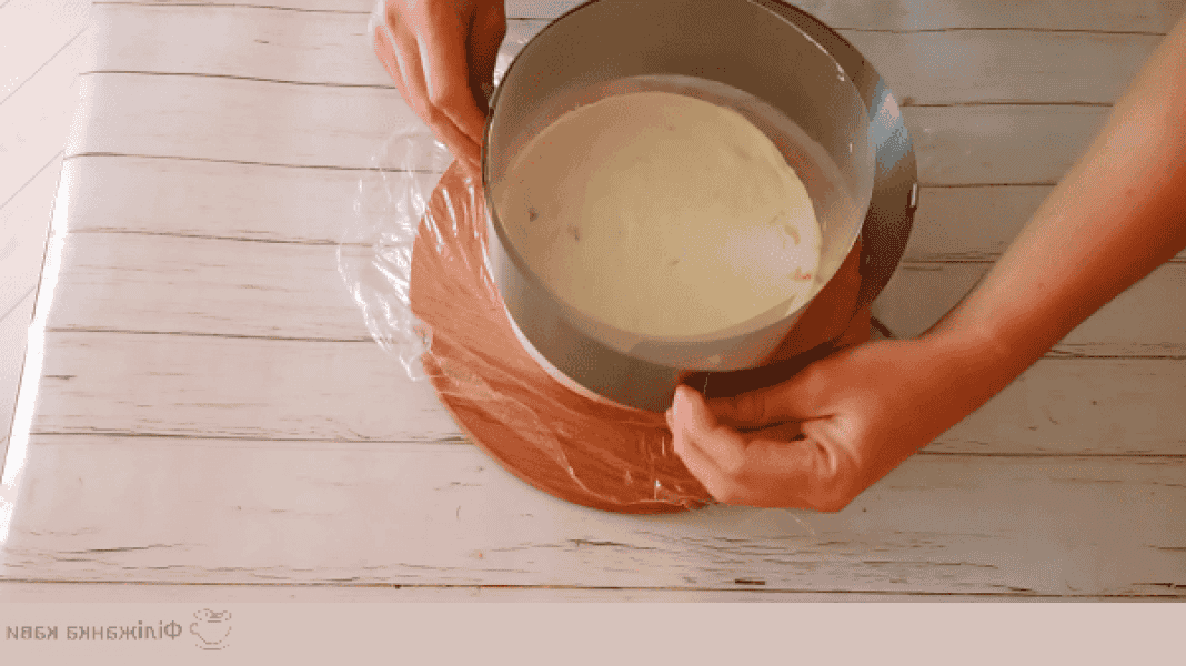 Після охолодження відкріплюю харчову плівку з форми. Витягаю кільце.