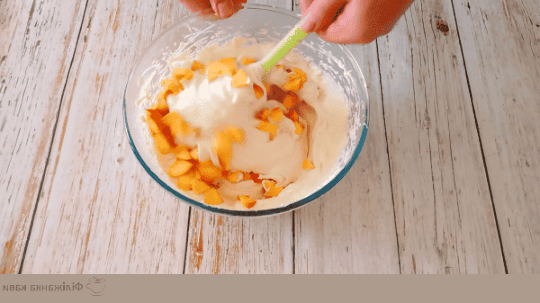 Додаю рубані на кубики персики. Швидкими рухами перемішую інгредієнти, щоб желатин не встиг ущільнити сирну суміш.