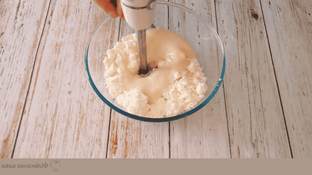 У жирний сир додаю згущене молоко і ванільний екстракт. Ретельно пробиваю блендером до однорідної, сирної суміші.