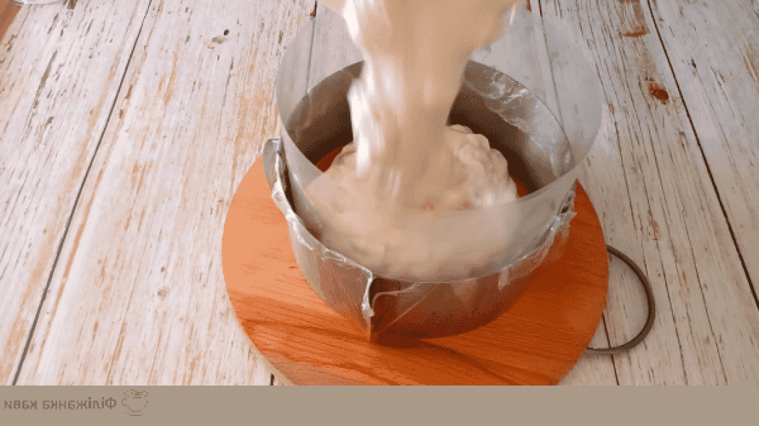 Рівномірно розподіляю суфле по всій площі форми силіконовою лопаткою. Відправляю форму з тортом в холодильник, мінімум на 5 годин для стабілізації сирного суфле.