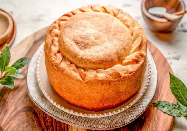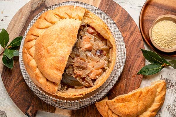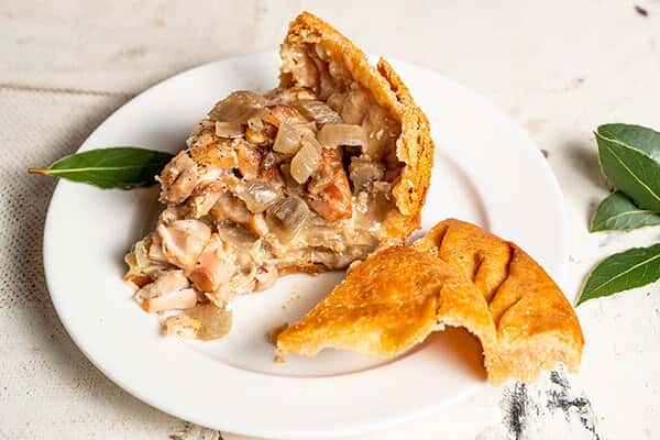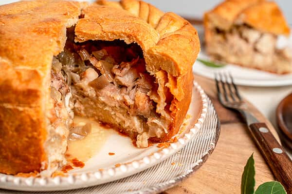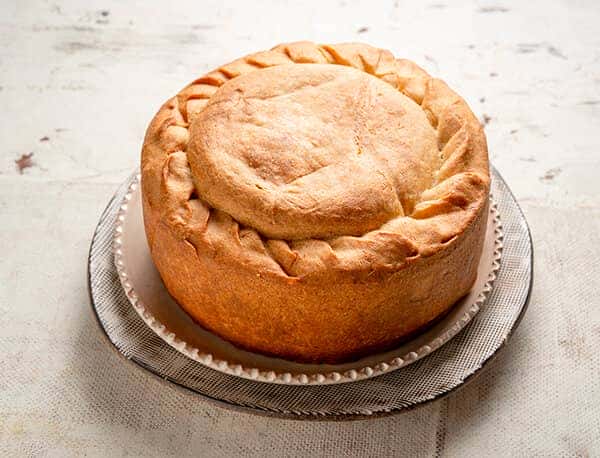 При подачі верхню частину пирога можна зрізати, а потім нарізати на порційні шматки. Пиріг їдять виделкою, а верхньою скоринкою пирога закушують.