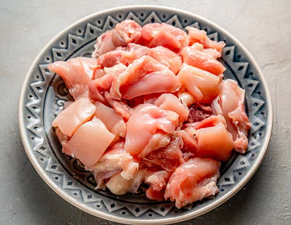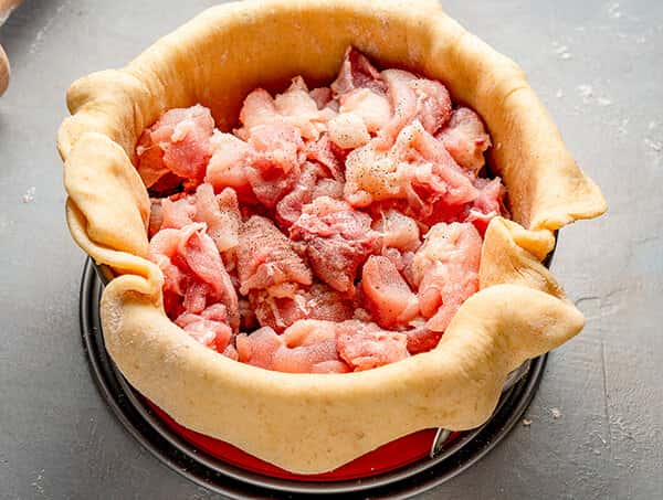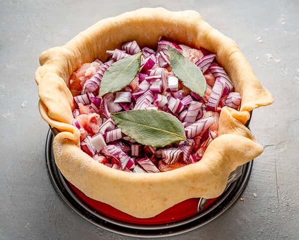 Наріжте м’ясо невеликими шматочками. Чим жирніше м’ясо, тим соковитіше вийде начинка. Іноді можна також додати шматочки шкіри і цілі шматки м’яса на кістках. Це дозволено, тому що пиріг їдять виделкою, а не відкушують.