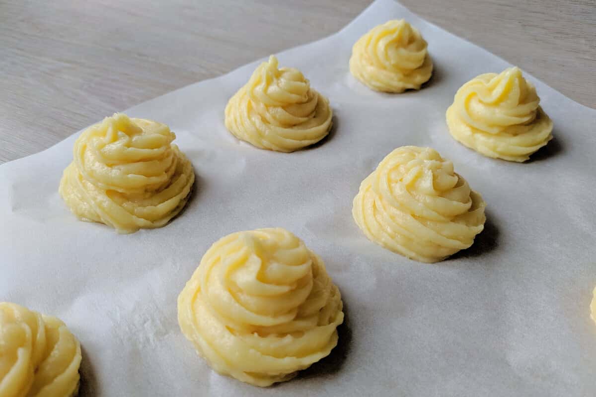 6. Перекладаємо масу в кондитерський мішок і відсаджуємо заготовки на деко, попередньо застелене пергаментом для випікання. Зверніть увагу, що в процесі випікання тістечка збільшаться в обсязі, тому розташовуйте їх на достатній відстані один від одного, щоб уникнути злипання.