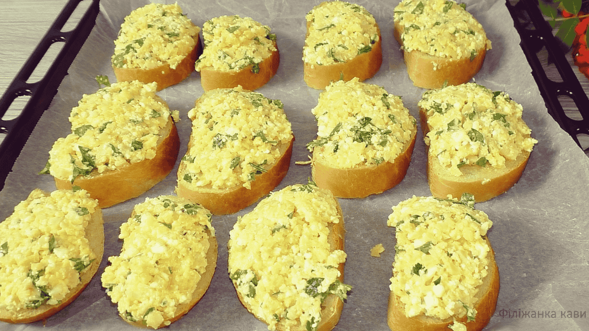 Деко застелити папером для випічки, на кожен шматочок хліба розподілити начинку і на деко.