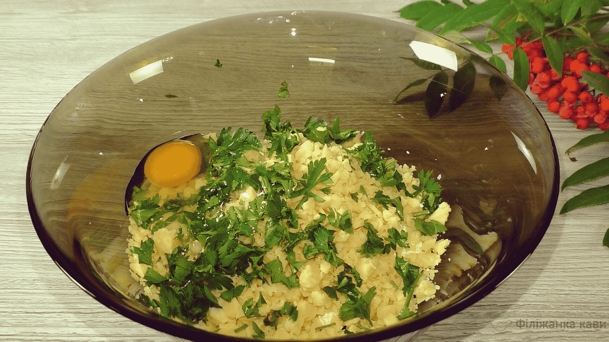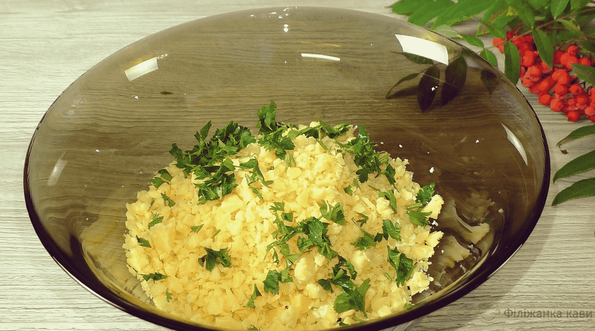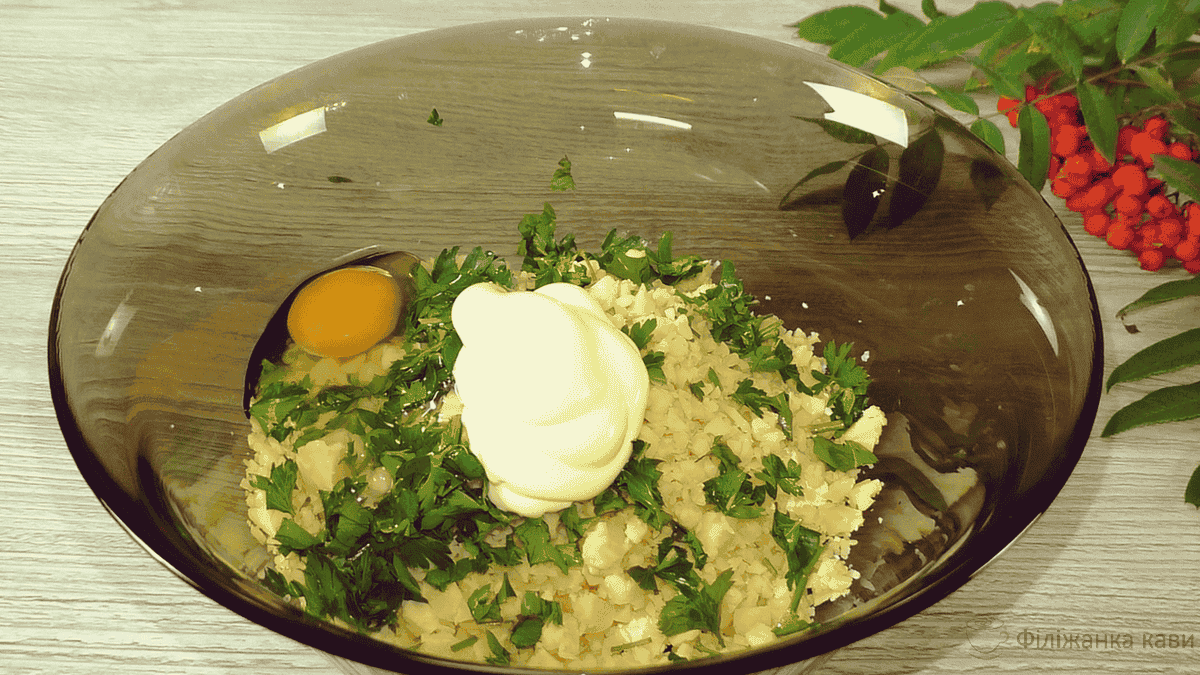 Додати 1 ст. л. майонезу, можна сметану брати, посолити, поперчити, перемішати і начинка готова. Кількість солі залежить від того наскільки солоний сир, орієнтуйтеся по своєму сиру.
