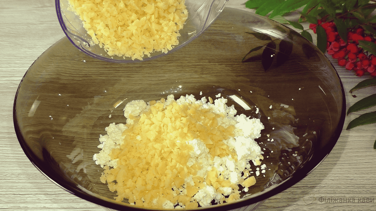 Тепер в мисці змішати сир ( жирність будь-яка ) з твердим сиром.