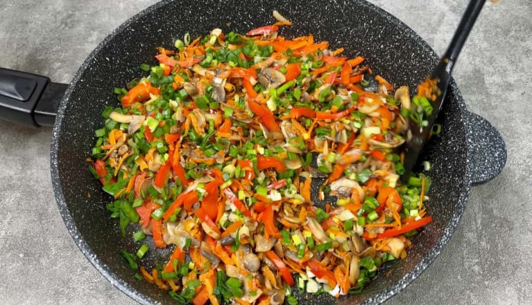 Попередньо треба подрібнити на терці моркву, нарізати соломкою солодкий перець. Ці овочі потрібно додати до печериць, гасимо разом 4 хвилини.