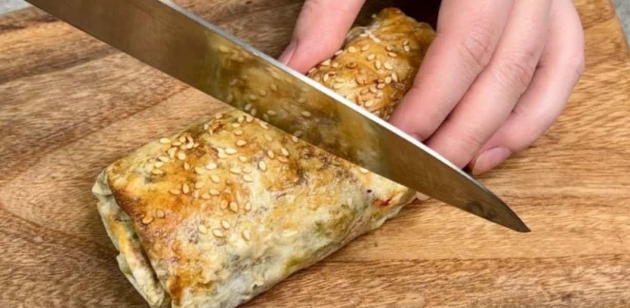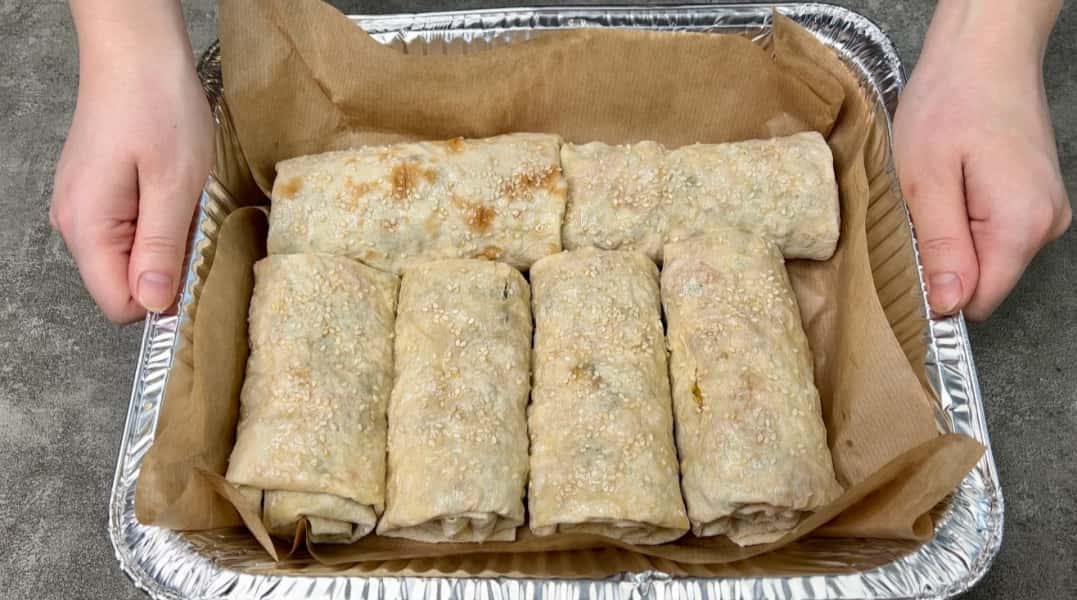 Необхідно скрутити начинку у лаваш, щоб сформувався рулет. Далі потрібно застелити лист пергаментом, викласти рулети і змастити жовтком.