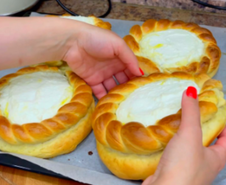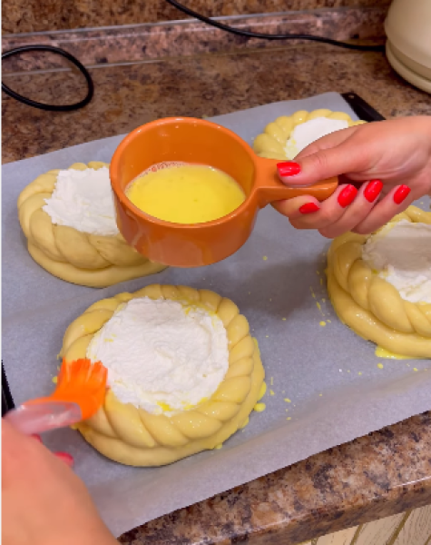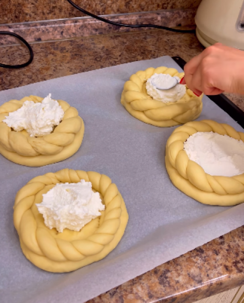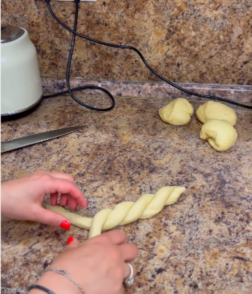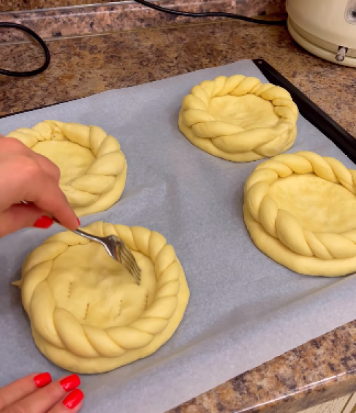 Тісто ділимо на 8 частин, 4 розкачуємо в коло, а 4 інші (ділимо на 2 частини і плетемо кіску).