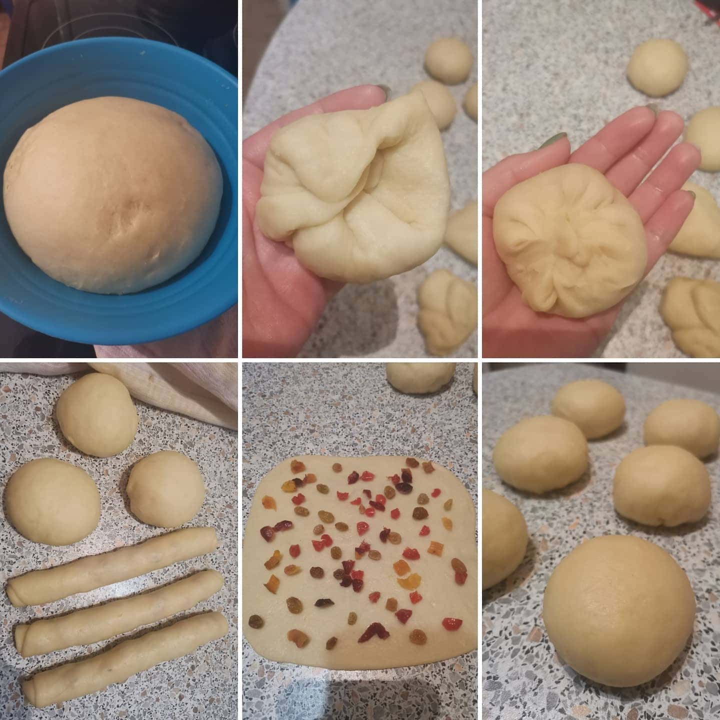 1. У миску просіюємо борошно пшеничне.📝Можливо вам знадобиться трохи менше або більше борошна. Саме тому використовуйте не все борошно відразу, а взяти для початку 450-480 гр – потім орієнтуватися за консистенцією тіста.2. Додаємо до борошна дріжджі, цукор та сіль.3. Все ретельно перемішуємо.📝Пресовані попередньо активізують у теплій солодкуватій рідині протягом 10-15 хвилин. У нашому випадку можна трохи підігріти 150 мл молока зі ст. л. цукру та розчинити в ньому дріжджі.4. Робимо в борошні поглиблення і наливаємо в нього трохи тепле молоко, розбиваємо 2 курячі яйця.5. Спочатку можна перемішати ложкою, щоб борошно зволожилося, а можна відразу замішувати руками.6. Додаємо до борошна 100 гр дуже м’якого вершкового масла, яке за кілька годин дістаємо з холодильника і залишаємо на столі грітися.📝Вводити масло потрібно не все відразу, а поступово – кожну нову порцію, коли попередня буде вмішана в тісто.7. Вимішувати тісто потрібно досить довго (не менше 10, а краще 15 хвилин) та інтенсивно. 📝В результаті воно стане гладким, однорідним, досить щільним та пружним.8. Округлюємо тісто в кулю і кладемо в миску. Відправляємо у тепло на 1 годину.📝 Через ~ годину (може знадобитися +/-) тісто збільшиться в об’ємі в 3 рази.9. Обминаємо тісто, щоб випустити газ, після чого знову округляємо його в колобок і даємо бродити ще близько години.10. Обминаємо його і ділимо на 2 рівні частини. Кожен шматок округляємо, підкачуємо до кулі. Далі ми будемо працювати з однією частиною тіста, тому другий колобок перекладаємо в новий поліетиленовий пакет, випускаємо повітря і щільно зав’язуємо його, залишаючи місце всередині. Кладемо тісто в холодильник – там воно буде чекати свого часу, поки ми займатимемося другим шматком.11. Ділимо колобок на 6 частин однакового розміру.12. Беремо один шматочок тіста, долонею кілька разів відбиваємо його в коржик, щоб забрати зайве повітря.Тепер заокруглюємо заготовку – підтягуємо тісто з країв до центру, притискаючи пальцями, щоб не розповзалося назад. Добре защипуємо шов.13. Перевертаємо кульку тіста швом униз і округляємо майбутні булочки. Так підкатуємо всі 6 заготовок.14. Накриваємо колобки харчовою плівкою та залишаємо прямо на столі хвилин на 10-15.