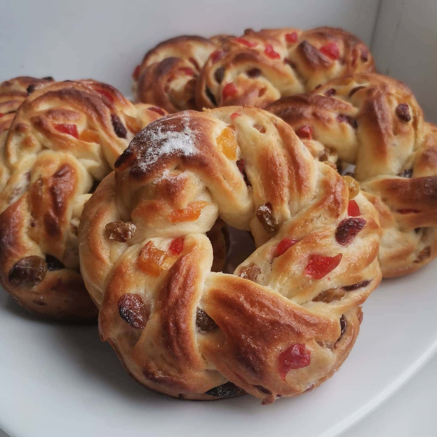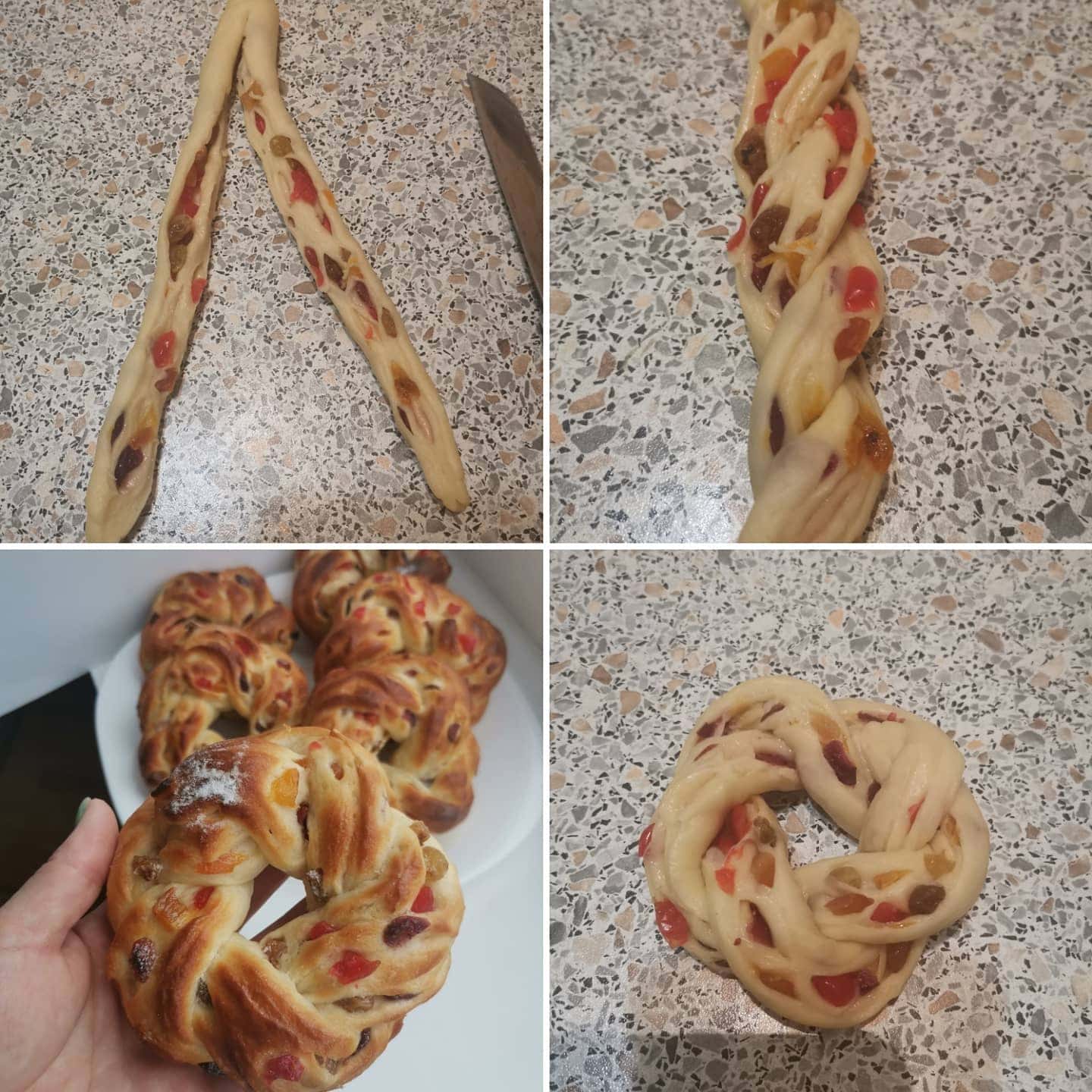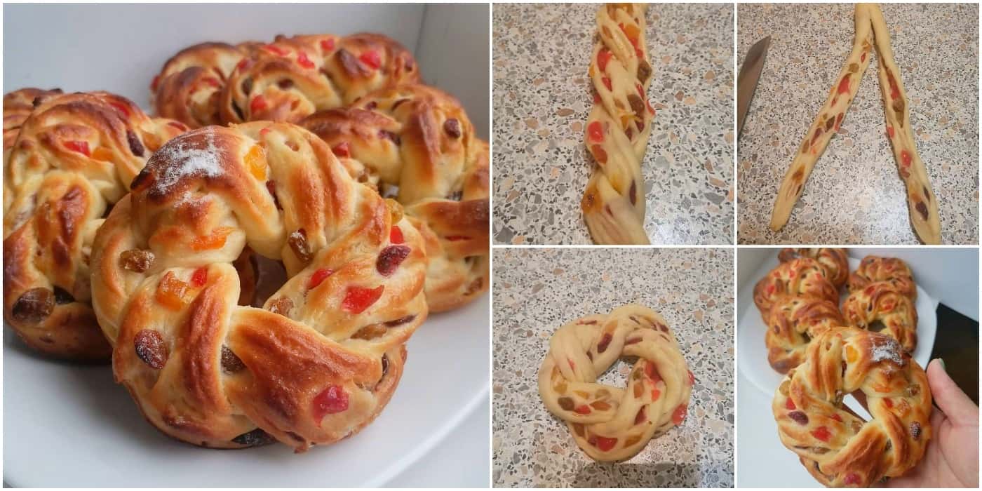 📝Якщо не дати заготовкам відпочинок, при розкачуванні тісто чинитиме опір: ви його розкачуєте качалкою, а воно сповзає назад.15. За допомогою качалки розкачуємо одну кульку дріжджового тіста в квадрат якнайтонше – в ідеалі товщиною не більше 2 мл. По всій поверхні розподіляємо подрібнені цукати.16. Акуратно скручуємо пласт тіста у досить щільний рулет. Аналогічно формуємо решту 5 рулетиків.17. Гострим ножем, розрізаємо заготовки вздовж на 2 частини, не розрізаючи до кінця – залиште пару-трійку см.18. Дві плоскі тіста, що вийшли, з цукатами потрібно переплести на зразок каната, намагаючись вивертати внутрішню частину назовні.19. Повертаємо косу у віночок. Кінці рулетика повертаємо вниз таким чином, щоб у процесі випікання вони не розійшлися, а місця з’єднання промазуємо трохи збитим білком.