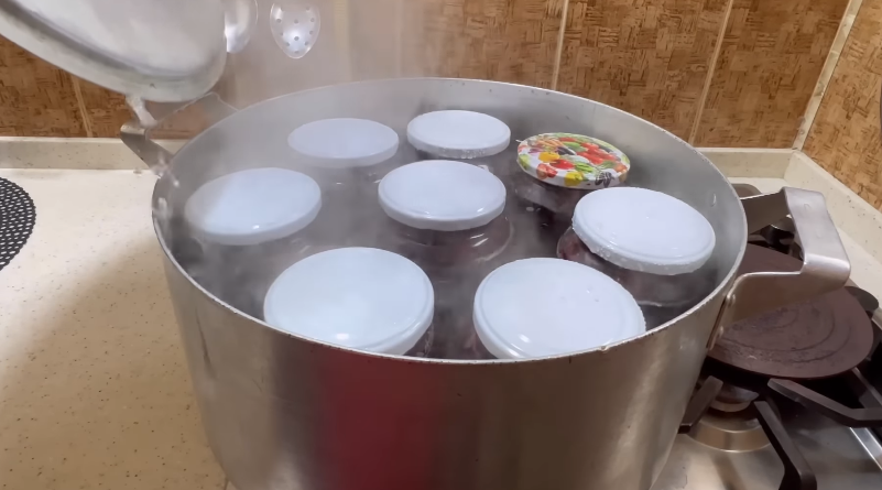 скласти в більшу каструлю, залити водою, стерелізувати – 30 хвилин.