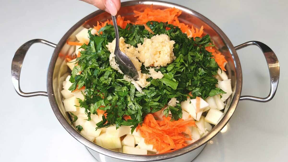 4. Додаю подрібнений часничок ( можна порізати його пластиночками ).