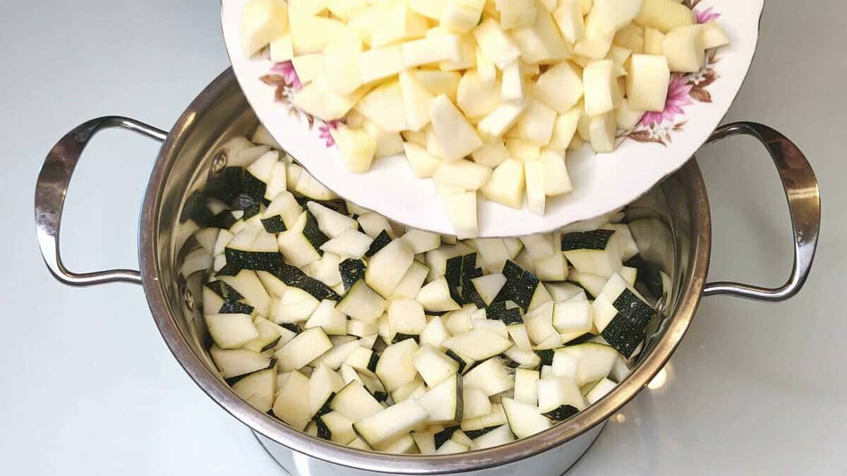 1. Очищаю кабачки від насіння і нарізаю маленькими кубиками. Я використовую звичайні кабачки і цукіні. Так заготівля виглядає красивіше.