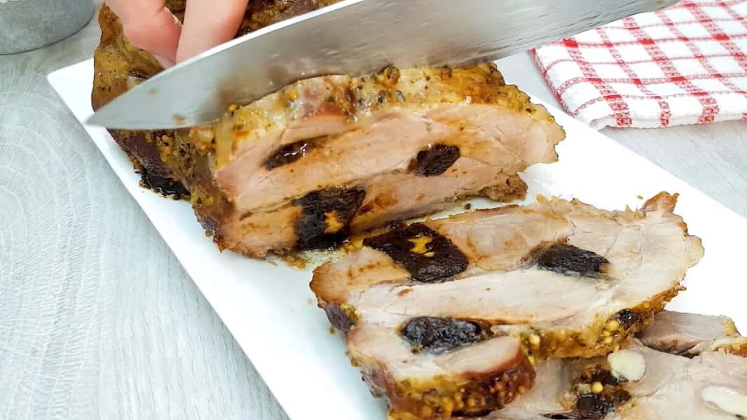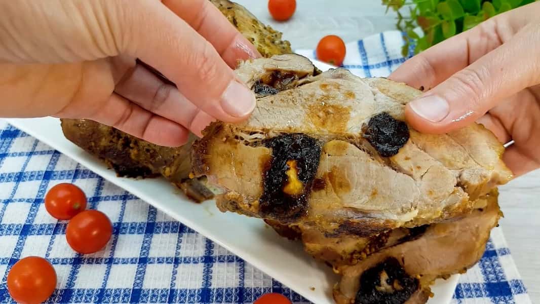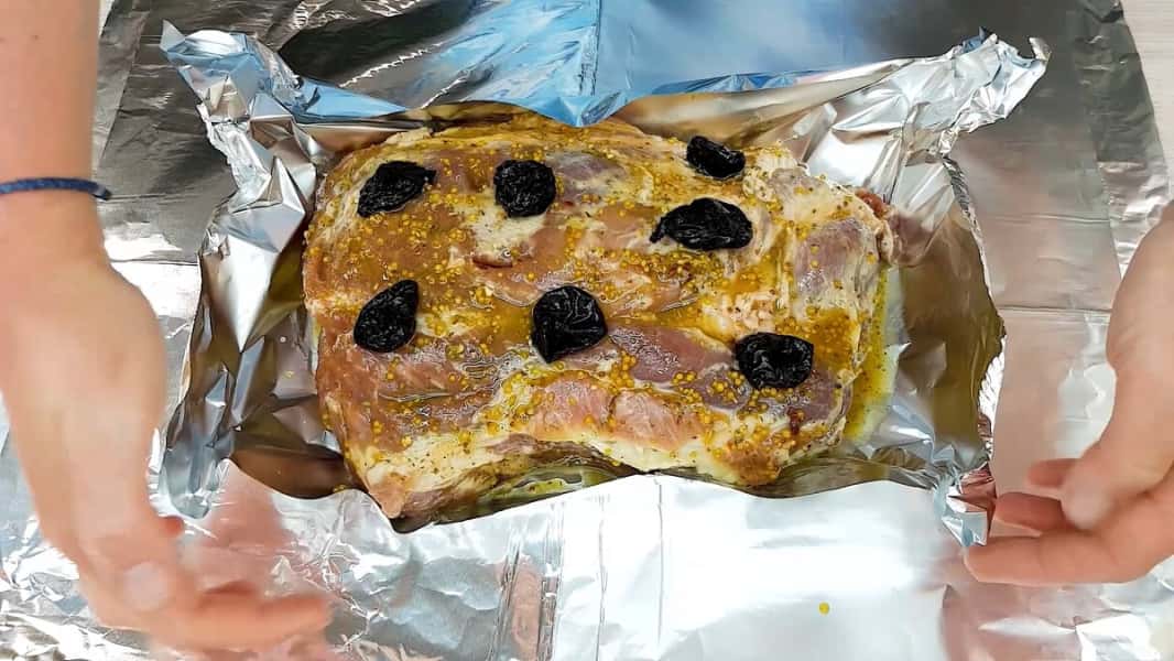 Викласти зверху на шматок м’яса чорнослив, що залишився (без горіхів усередині) і добре загорнути у фольгу. Прибрати м’ясо в холодильник щонайменше на 2 години, а краще на ніч, щоб добре замаринувалося