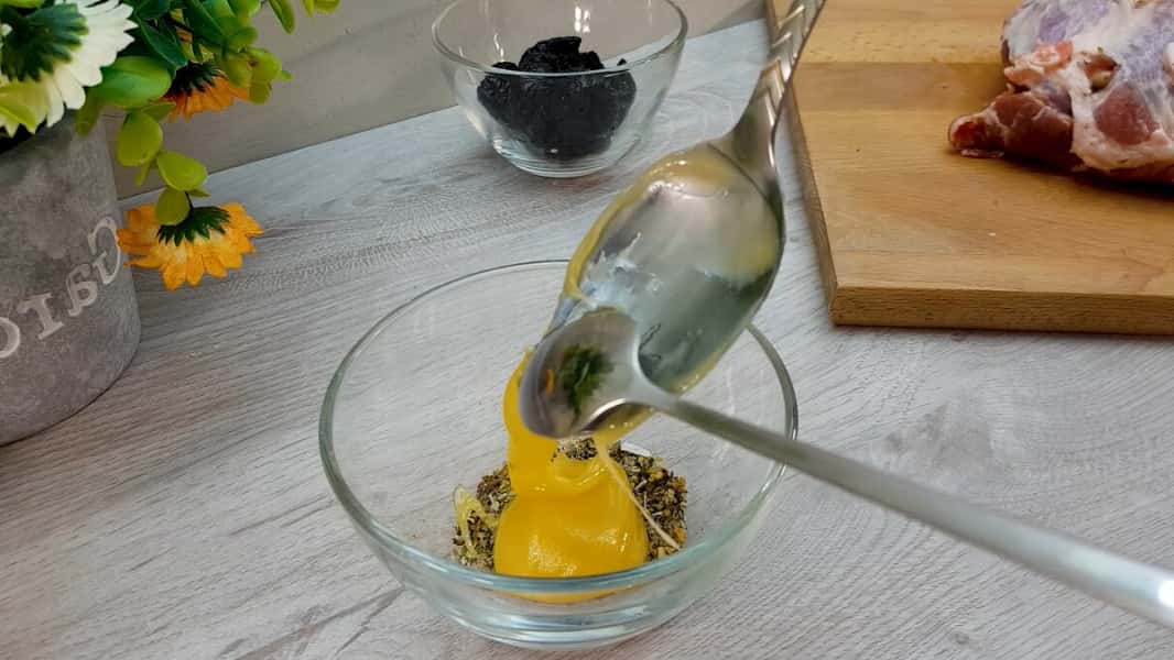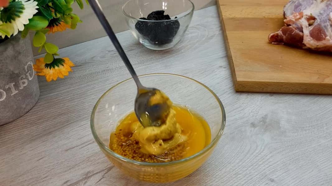 До сухої пряної суміші, що залишилася, додати 2 ст. л. меду, 2 ст. л. гірчиці (у мене два види звичайна та цільнозернова) та 3 ст. л. коньяку. Усі інгредієнти ретельно перемішати до однорідності