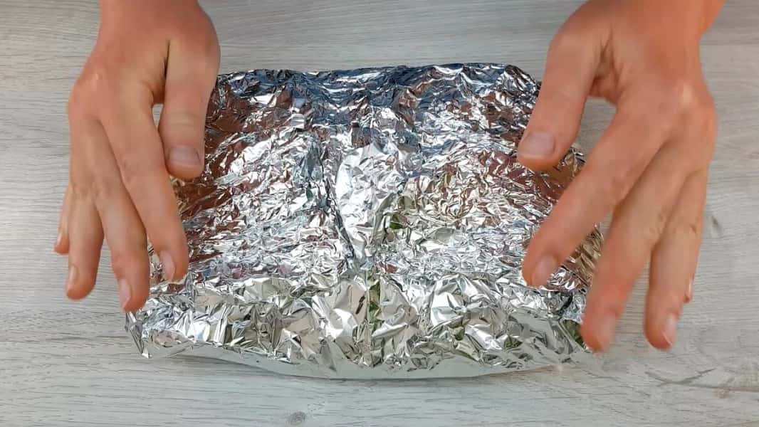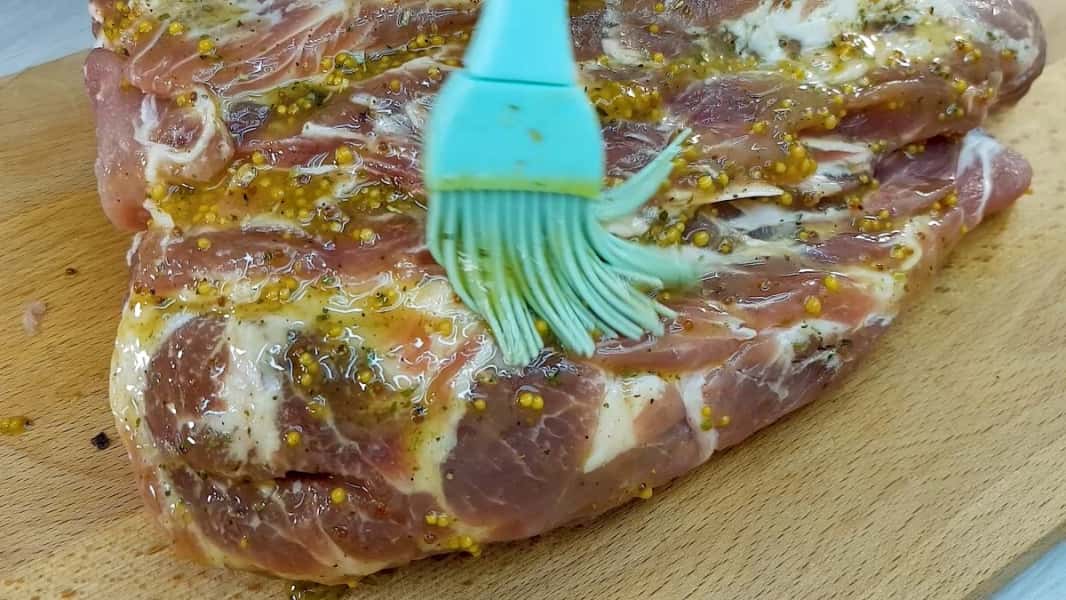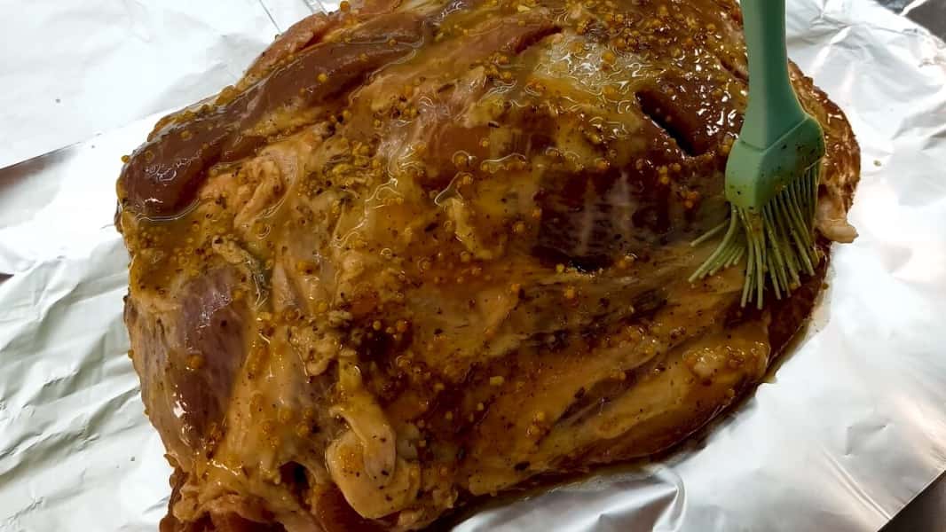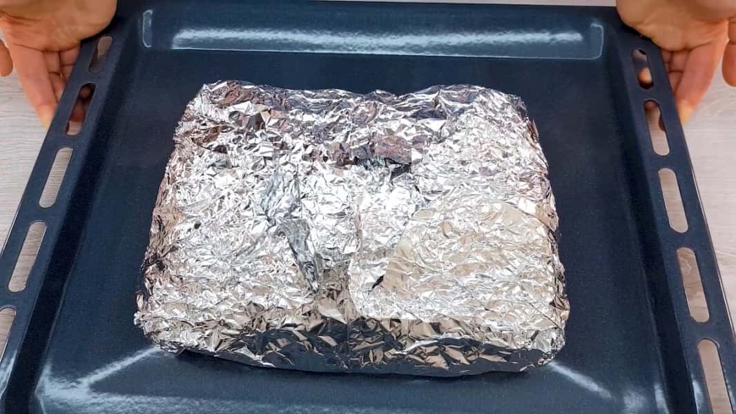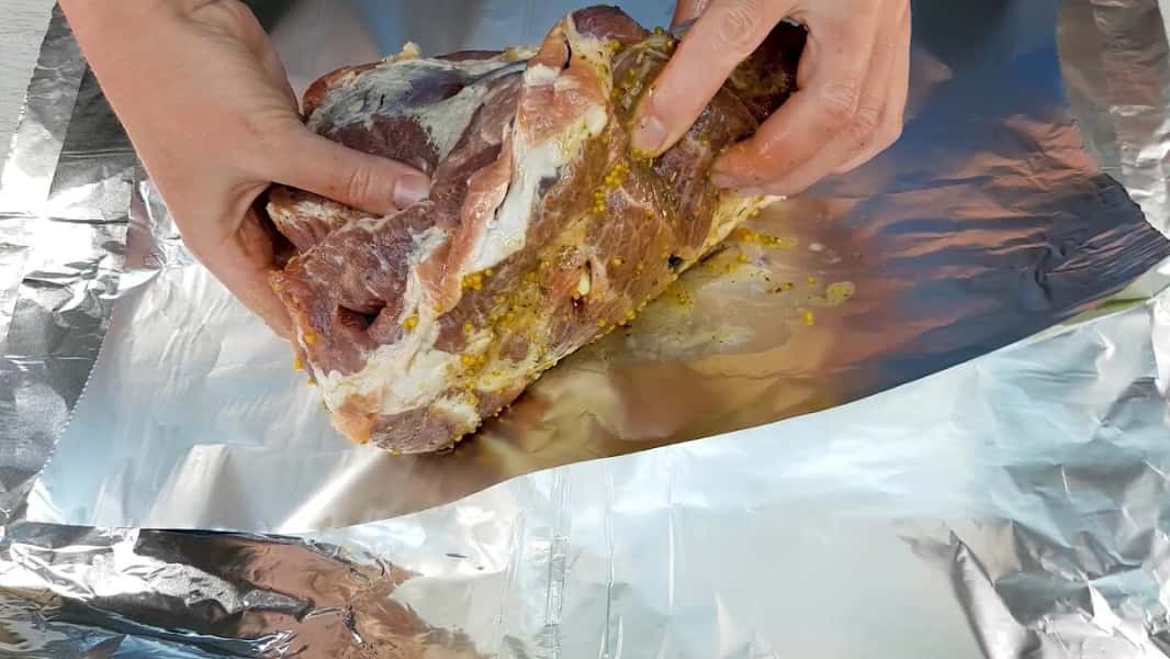 Цим соусом ретельно змастити нафарширований шматок м’яса спочатку з одного боку, потім покласти на підготовлену фольгу та змастити з іншого боку. Фольги треба брати багато, щоб не випливав під час запікання сік