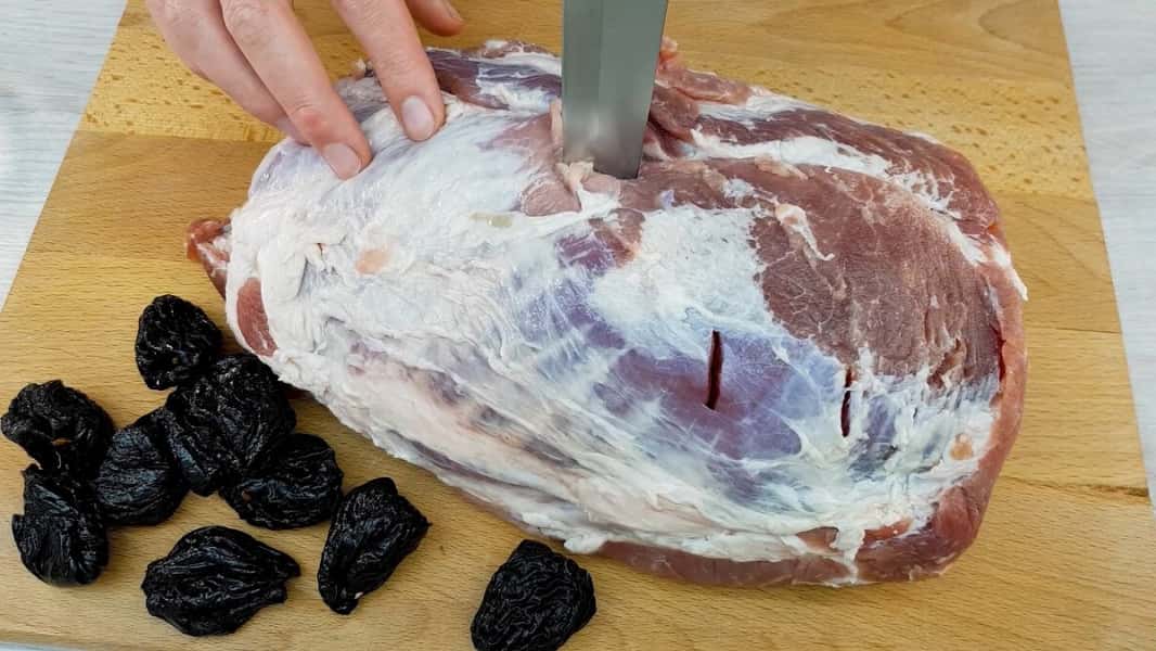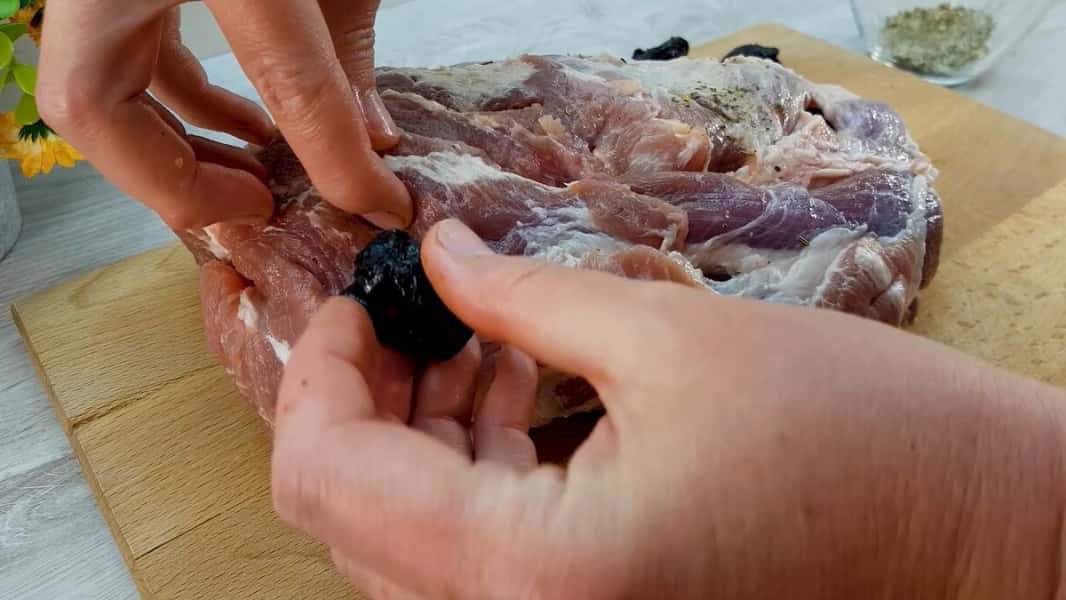 У підготовленому шматку м’яса зробити ножем глибокі проколи. Ці проколи заповнити начиненим чорносливом та часником. У проколи, де буде часник, додати трохи сухої пряної суміші. У мене на цей шматок пішло 10 штук начиненого горіхом чорносливу та 10 середніх зубчиків часнику