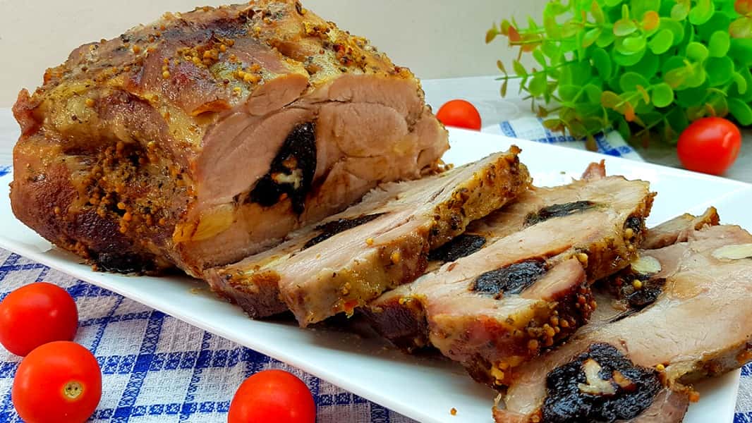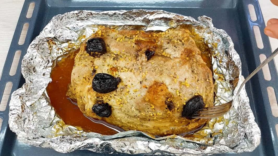 Замариноване м’ясо запікати в духовці 2 години при 180*С (1 година запікання на 1 кг м’яса). Через 2 години дістати з духовки лист, розгорнути акуратно фольгу, прибрати зверху чорнослив, змастити соком від м’яса і поставити у духовку не закриваючи фольгою приблизно на 10 хвилин