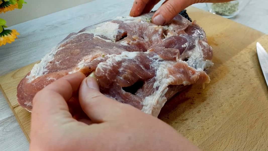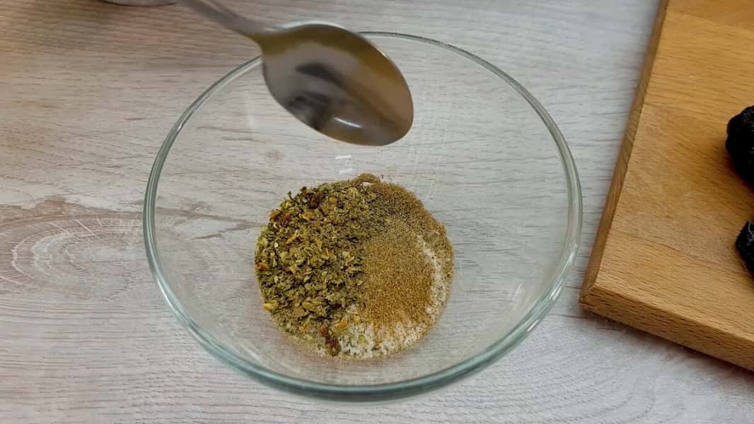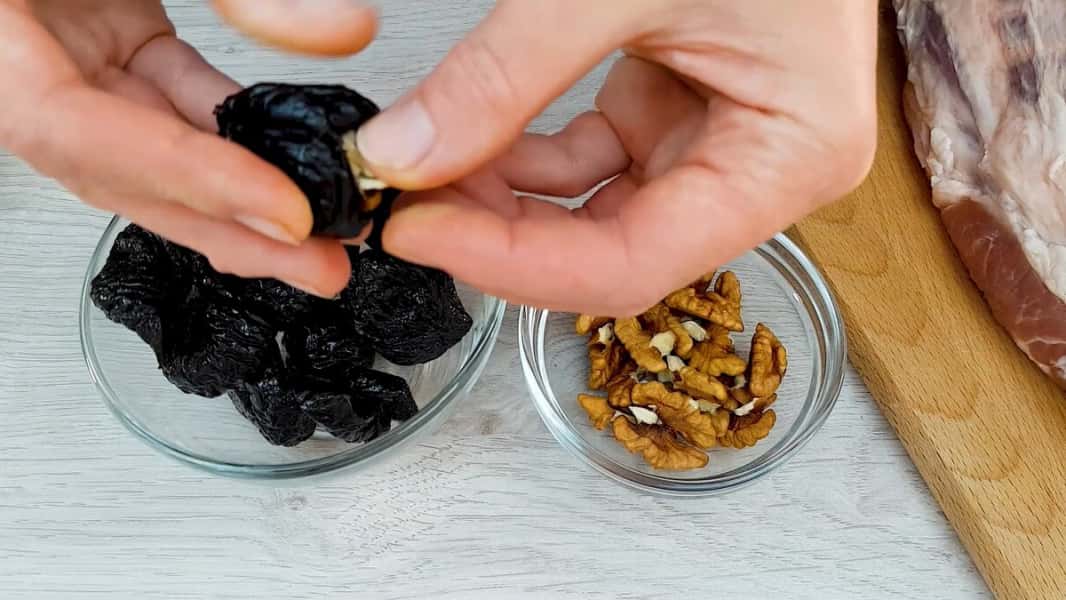 Підготувати інгредієнти для начинки м’яса: для цього промити теплою водою чорнослив, обсушити його та начинити четвертинками волоського горіха. Почистити часник. Зробити солоно-пряну суміш із 2 ч.л. солі, 1 ч.л. прованських трав, 1/2 ч.л. гострого перцю та чорного меленого перцю (його брати на свій смак).