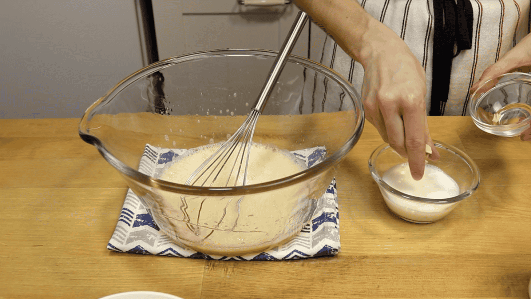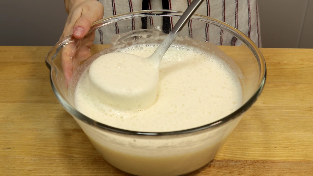Коли тісто добре підніметься, перемішую вінчиком і можна пекти млинці.