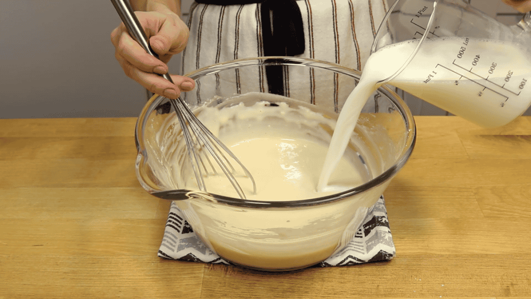 Вимішую до гладкості, щоб не було грудочок. Вливаю молоко, що залишилося.