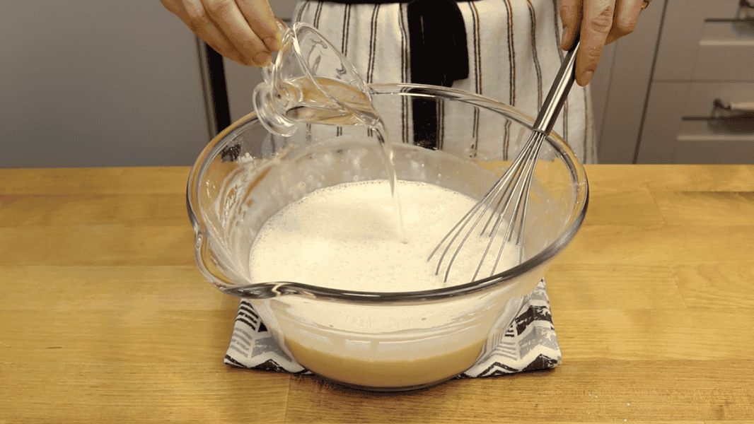 Додаю половину молока. І всипаю борошно.