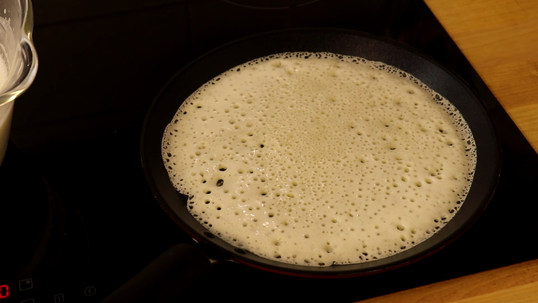 Наливаю тісто та розподіляю по всій сковороді. Тісто буде пузиритися.
