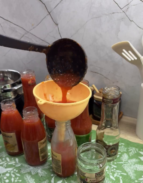 Заповнити кетчупом стерилізовані банки та закрити стерилізованими кришками.
