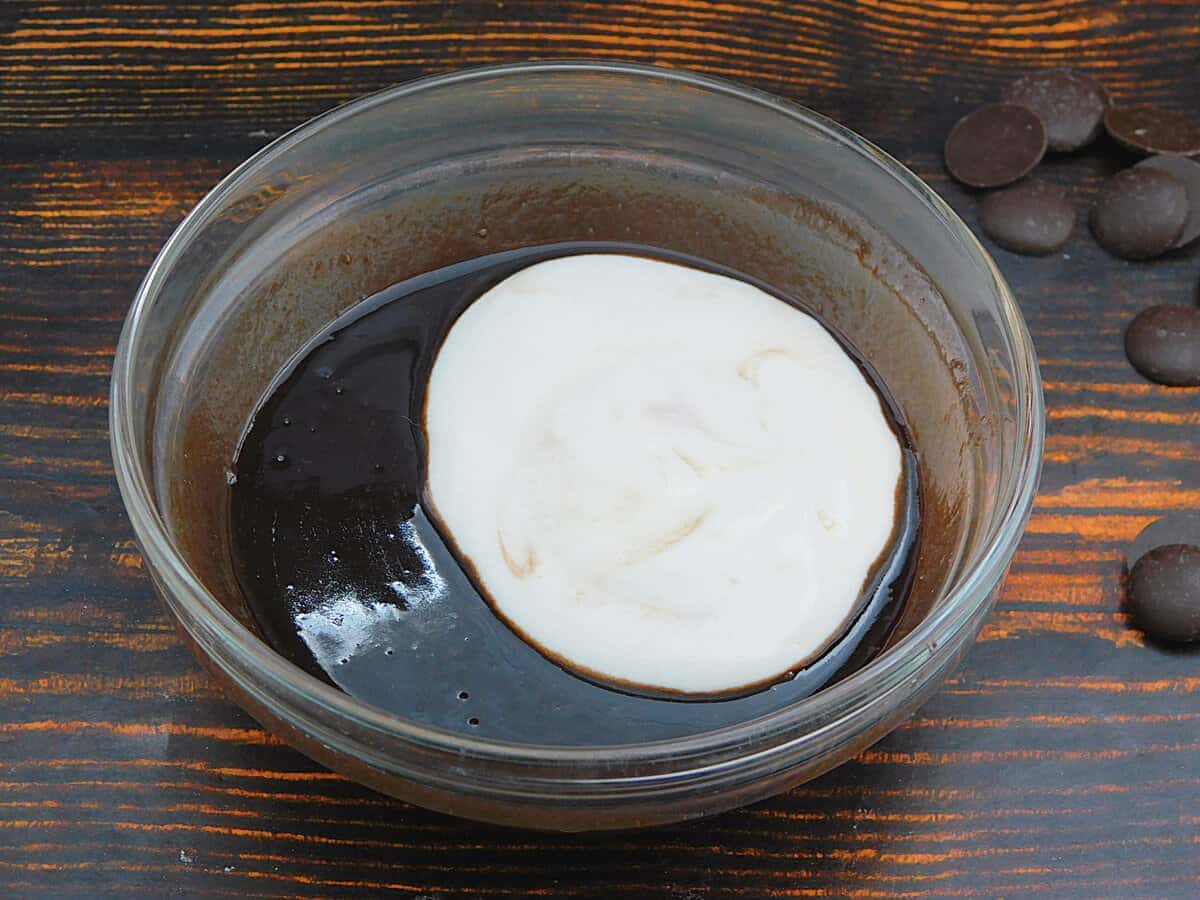 8. Шоколад розтопити в мікрохвильовці, додати 2 столові ложки крему. Перемішати.